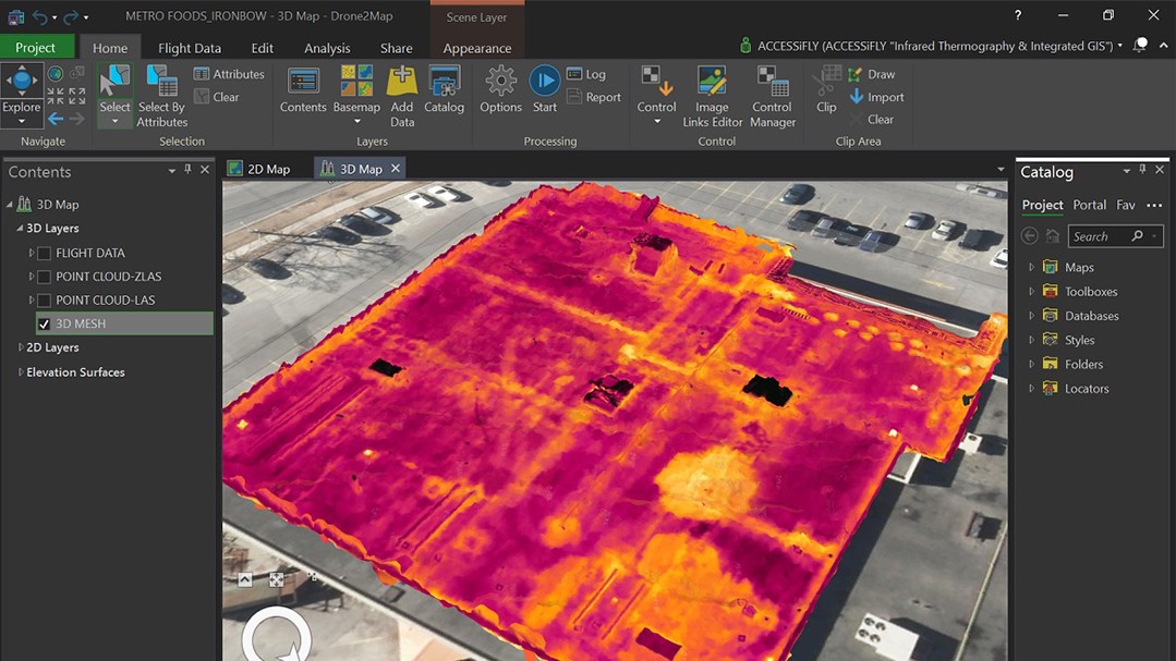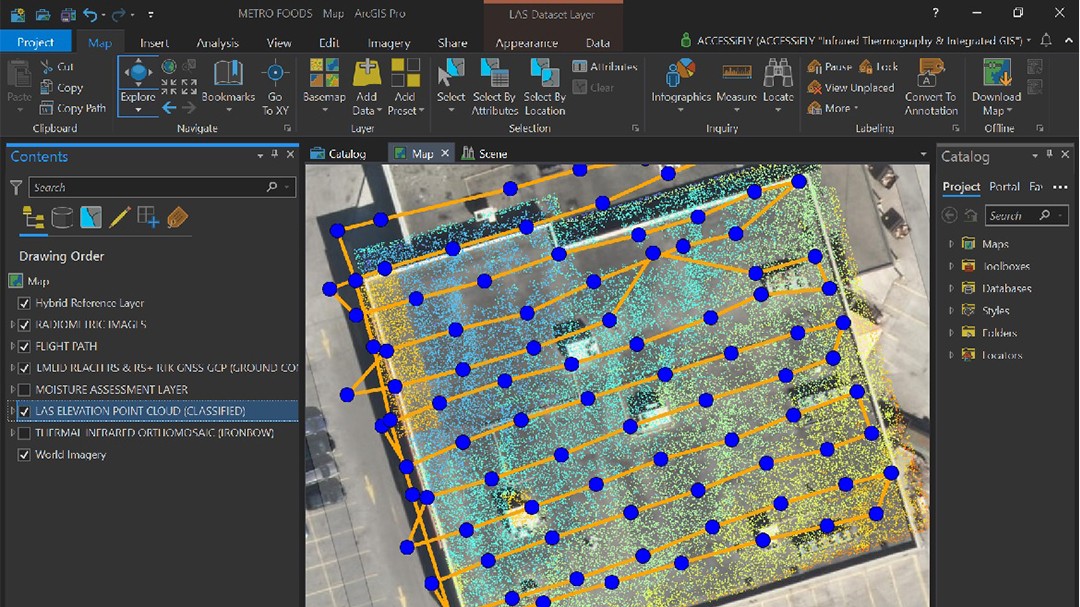 フリアーシステムズ社の熱赤外カメラを搭載した RPAS(遠隔操縦航空機システム)を使ってドローン検査を行い、潜在的な問題点や非効率性を発見するのもそのひとつだ。ACCESSiFLY 社は、熱赤外データを含む建物とその周辺を検査するワークフローを開発していた。