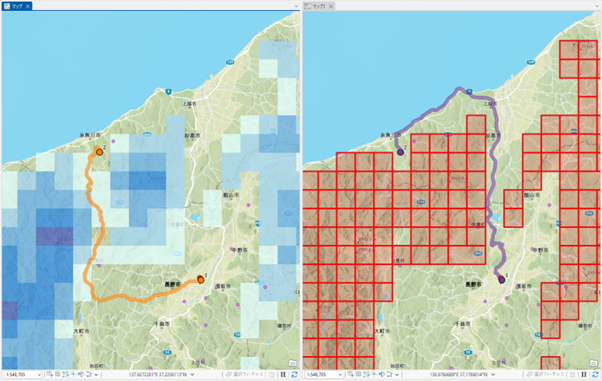 積雪深の多いルートの回避例(左:通常ルート、右:回避ルート)